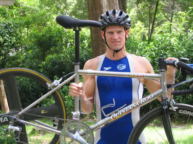 Triathlete Darin Shearer and his tri bike (shown here with road bar