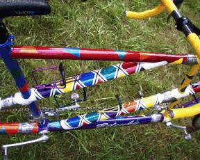 The "Fiesta" paint job is the prodigy of Tailgunner John C. Smith's sister, artist Margaret Lee. We brainstormed several evenings in a lodge at Snow Mountain Ranch in Frasier, Colorado, over Christmas, 1997, developing the final concept. Dave Cimino, an employee of GT Bicycle's R&D Department in Longmont, Colorado, and painter of the US National, Saturn Professional, and US Olympic Team bicycles (to name a few) finished our cromoly canvas with top-quality German-made Sikkens enamel. Dave tells us it's unquestionably the most elaborate bike finishing job he's done, and he's justly proud of the result. One friend from California who saw a picture of the bike commented, "Looked at the 2 + 1 = 3 bicycle on the coupling site. What was the paint scheme I was seeing there? Looked a little psychedelic...the water supply secure in the Boulder area?" We think it reflects the good cheer not just of the riders on her but the smiles and comments of passers-by as well!