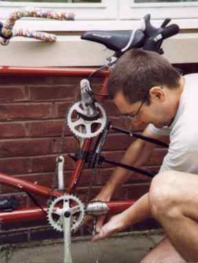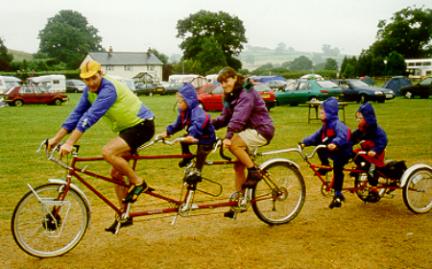 The triplet was originally a Swallow custom tandem circa 1993. Pete Bird of Swallow converted it by dropping the rear seat tube, seat stays & chain stays off and adding the new section. This is stepped as we decided to get clearance for a suspension seat tube. The original plan was to have an extra lateral, either from the captains seat tube/top tube joint or from the middle joint. After a bit of experimentation Pete thought it would be stiff enough as an open design & it maked building a lot easier. It also means we can split the frame with just two couplers. We transport it on the back of our Ford Galaxy (I think you call them a mini-van), using a standard Pendle tow bar mounted bike rack. The normal sequence of events is as follows:
