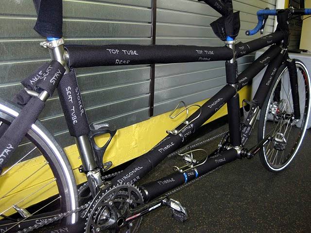 Tube covers are used to prevent frame tubes and components from getting scratched when a bicycle is packed. They are made from foam that is sandwiched between nylon fabric and loop fabric. Covers come in 10 foot length and various widths (see table). A hook material is sewn on opposite side of the loop fabric along the entire 10 ft. length. Tube covers are custom fit to each frame by the builder or consumer by simply cutting a piece of material of sufficient length from the ten foot roll to cover any length tube. Once a flat piece of material is cut to the proper length, it is wrapped around the tube to form a protective sleeve that is held closed by the hook and loop material. Leaving the cover extra long to protect the end of the S and S Coupling and its teeth is a good idea.