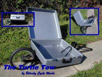 The turtle tow is single 16" wheel trailer custom fabricated to be used in conjunction with an S & S hard case; the chassis can be removed from the case and are packable into the case with most of a coupler single bike. (you will need some type of collapsible soft pack or wheel bag for your bike's rear wheel.