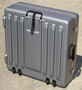 This case provides the best protection for airline use and since it pulled by it's narrow side, it's very maneuverable in tight places.. This is the case to choose if you have a place to store the case once you reach your destination. It has a silver-gray high density polyethylene shell, two locking latches, heavy duty recessed ball bearing wheels and a flip out handle for easy pulling or pushing. For maximum protection we recommend that up to 4 compression members be used with this case. Case dimensions are 26" x 26" x 10" (click here for a dimensioned drawing of the case interior) which meets the typical airline standard maximum size limit of 62" combined (length + width + thickness).