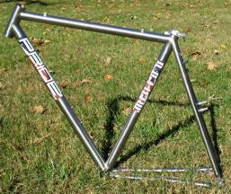 Road Frames Available in titanium or 4130 chromoly steel. PRIDE exclusive extended dual junction seat stays that add unsurpassed lateral stiffness and vertical compliance (optional at no extra charge) We build frames with traditional style seat stays as well. An elliptical top tube that further increases lateral stiffness in the front Symmetrically bent chain stays offer tire clearance for up to a 28C tire Head tube mounted cable bosses for quick and easy adjustment during ride Common sense cable routing Welded in water bottle bosses A lifetime transferable warranty The PRIDE exclusive extended dual junction seat stays don't give a harsh ride like similar designs do. The difference is in the material. Titanium absorbs shock very well. Similar designs have been built out of aluminum and steel. The steel was somewhat forgiving but the aluminum frames were extremely harsh. |