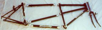 There are two methods for positioning S and S Couplings in a tandem frame for non-airline use (DOES NOT FIT into an airline regulation size checkable case.) Both methods separate the tandem into 2 pieces or sections. With either method, the tandem will have a front triangle and a rear triangle although they may be unequal in size depending on the placement of the couplings.